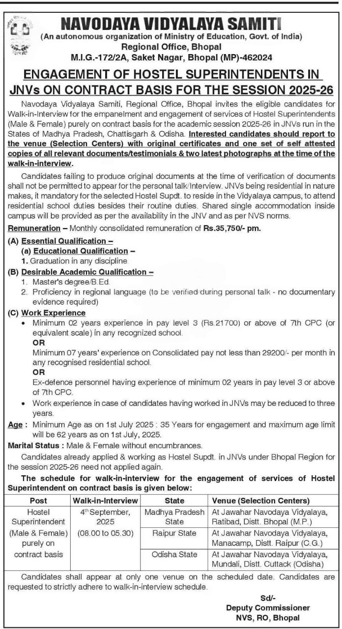 RECRUITMENT OF HOSTEL SUPERINTENDENT AT JNV OF ODISHA, MADHYA PRADESH & CHHATTISGARH. Walk-in-interview on 4.09.2025
