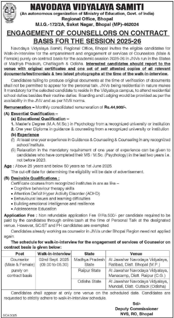 RECRUITMENT OF COUNSELLOR AT JNV OF ODISHA, MADHYA PRADESH & CHHATTISGARH. Walk-in-interview on 2.09.2025