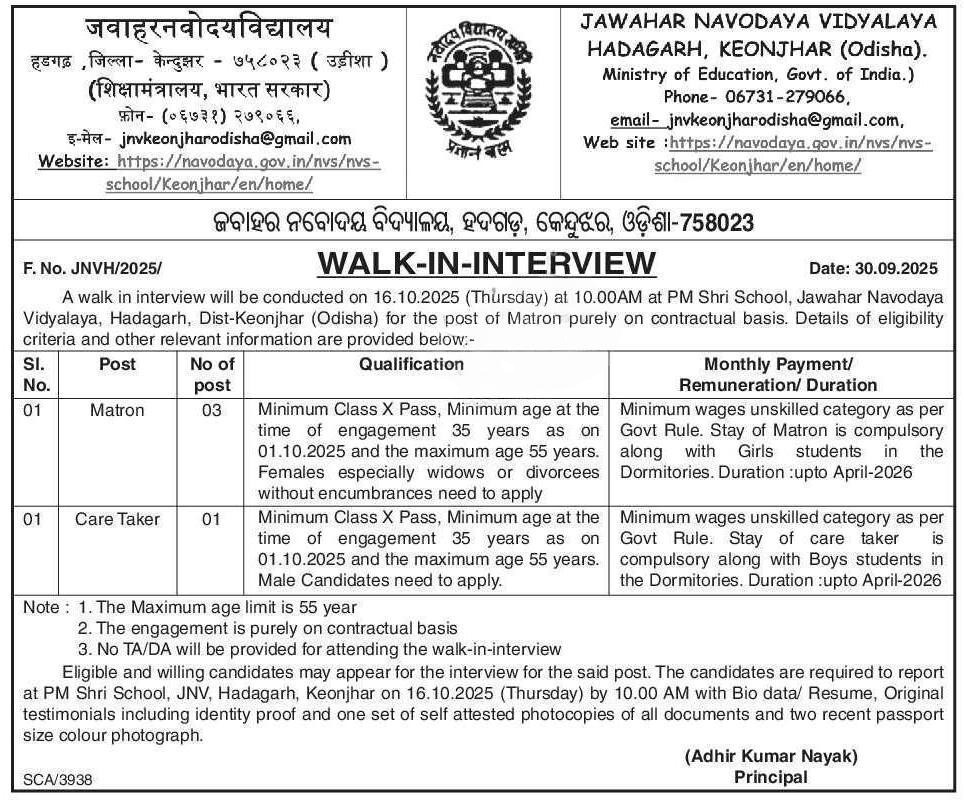 A walk in interview will be conducted on 16.10.2025 (Thursday) at 10.00AM at PM Shri School, Jawahar Navodaya Vidyalaya, Hadagarh, Dist-Keonjhar (Odisha) for the post of Matron purely on contractual basis. Details of eligibility criteria and other relevant information are provided below: