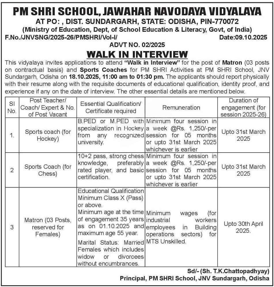 Walk-in Interview: Matrons & Sports Coaches (PM SHRI School, JNV – Sundargarh)