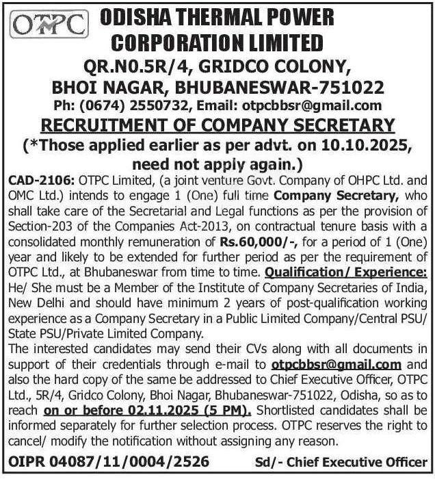 Odisha Thermal Power Corporation (OTPC) Limited, a joint venture government company of OHPC Ltd and OMC Ltd., is looking for a highly skilled and experienced professional to join our team in Bhubaneswar.