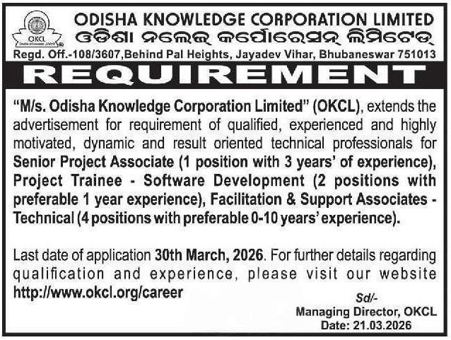 OKCL Recruitment 2026: Odisha Knowledge Corporation Limited (OKCL) has released a fresh recruitment notification for qualified and experienced technical professionals. Interested candidates looking for career opportunities in the technical and software development sectors can apply for these positions before the month-end deadline.