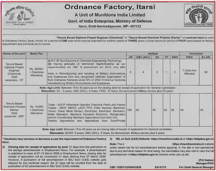 Ordnance Factory Itarsi Recruitment 2026: Ordnance Factory, Itarsi, a unit of Munitions India Limited (Govt. of India Enterprise, Ministry of Defence), has released an official recruitment notification for tenure-based positions. Applications are invited from eligible candidates for the posts of Diploma Project Engineer (Chemical) and Chemical Process Worker on a contract basis.