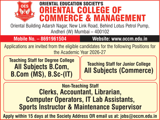 Oriental College of Commerce & Management Recruitment 2026: Oriental College of Commerce & Management (OCCM), Mumbai under the Oriental Education Society, has released a recruitment notification inviting applications from eligible candidates for various Teaching and Non-Teaching positions for the upcoming Academic Year 2026-27.