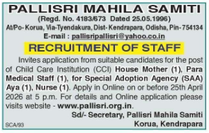 Pallisri Mahila Samiti Kendrapara Recruitment 2026: Pallisri Mahila Samiti, a registered organization based in Kendrapara, Odisha, has invited applications for various staff positions within its Child Care Institution (CCI) and Special Adoption Agency (SAA).
