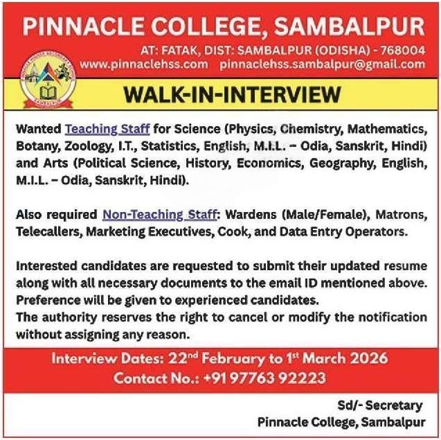 Pinnacle College Sambalpur Recruitment 2026: Are you a passionate educator or a professional looking for a stable job in Sambalpur? Pinnacle College, Sambalpur is expanding its horizons and looking for dedicated individuals to join the academic family for the 2026 session.