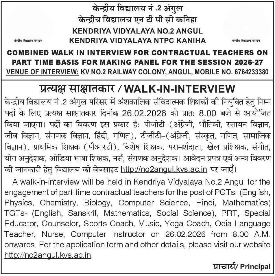 PM SHRI KV Angul Recruitment 2026: PM SHRI Kendriya Vidyalaya No. 1, Angul is conducting walk-in interviews for various contractual and part-time positions for the 2026-27 session.