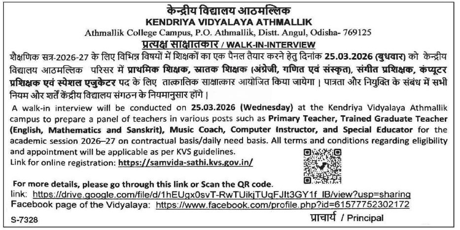 KV Athmallik Walk-in Interview 2026: Various Teaching Posts