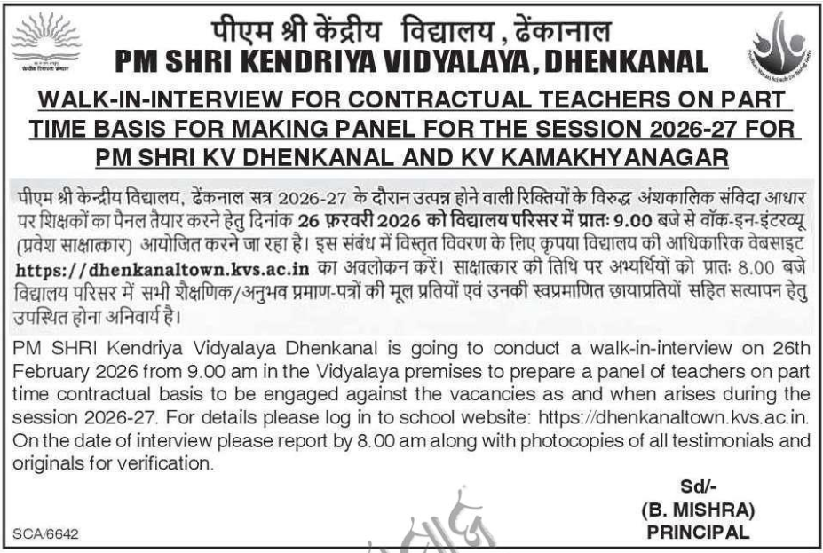 PM Shri KV Dhenkanal Recruitment 2026-27: PM SHRI KV Dhenkanal is inviting eligible candidates for a walk-in interview to prepare a panel of teachers on a purely contractual and part-time basis for the upcoming academic session. This panel will serve both PM SHRI KV Dhenkanal and KV Kamakhyanagar.