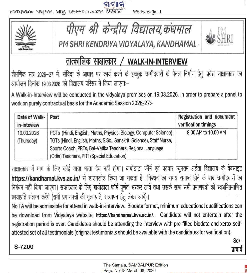 PM SHRI KV Kandhamal Recruitment 2026: PM SHRI Kendriya Vidyalaya, Kandhamal has announced a walk-in interview for the preparation of a panel of teachers and staff on a purely contractual basis for the Academic Session 2026-27.
