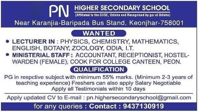 PN Higher Secondary School Keonjhar Recruitment 2026: PN Higher Secondary School, Keonjhar (Affiliated to CHSE, Odisha), invites applications for teaching and non-teaching positions. If you are looking for the latest jobs in Odisha, check the details below: