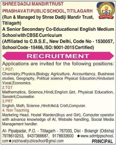 Vacancy details for Prabhavati Public School Recruitment Titilagarh