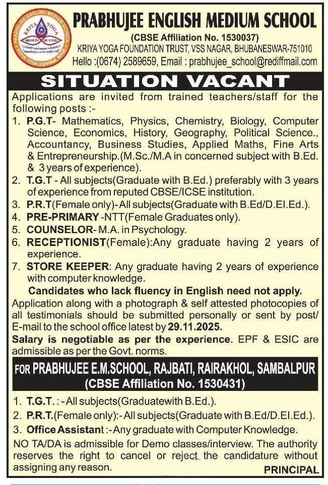 👩💼 Positions Available for Prabhujee English Medium School Recruitment Odisha