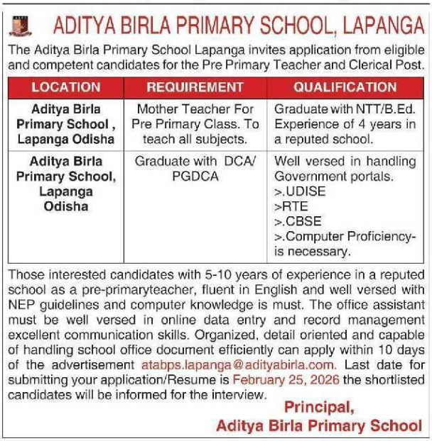 Recruitment at Aditya Birla Primary School Lapanga Sambalpur 2026: Aditya Birla Primary School, Lapanga Sambalpur (Odisha), has released a recruitment notification inviting applications from eligible and competent candidates for Pre-Primary Teacher and Clerical positions. If you are a dedicated educator or an efficient administrative professional, this is your chance to join a prestigious institution.