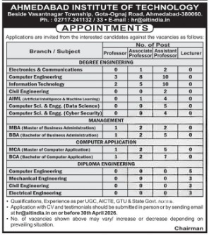 Recruitment at Ahmedabad Institute of Technology (AIT) 2026: Ahmedabad Institute of Technology (AIT) has announced a major recruitment drive for faculty positions across various departments, including Engineering, Management, and Computer Applications. Applications are invited for the roles of Professor, Associate Professor, Assistant Professor, and Lecturer.
