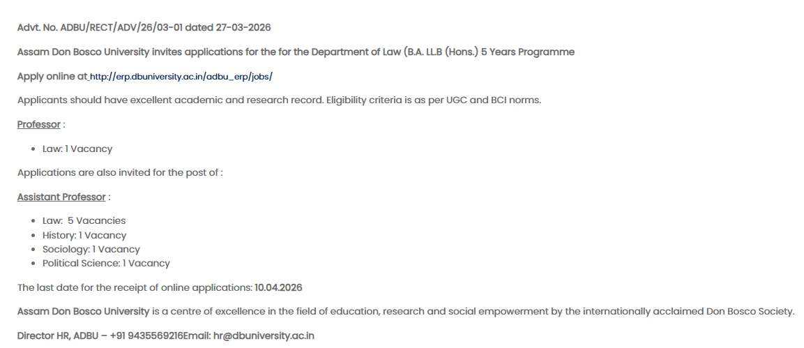 Recruitment at Assam Don Bosco University 2026: Assam Don Bosco University (ADBU) has released an official advertisement seeking qualified candidates for various faculty positions within the Department of Law (B.A. LLB Hons. 5 Years Programme). If you have a strong academic and research background, this is an excellent opportunity to join a premier educational institution.