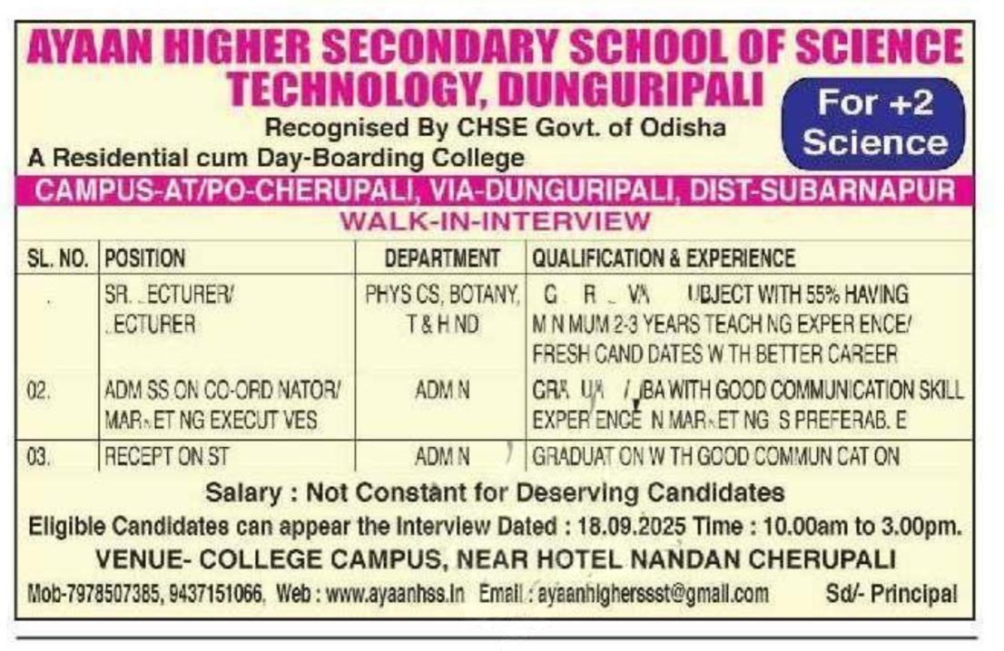 Are you an enthusiastic educator or administrative professional looking to advance your career? Ayaan Higher Secondary School of Science & Technology, a recognized residential and day-boarding college in Dunguripali, Sonepur, Odisha is inviting qualified candidates to attend a walk-in interview for teaching and non-teaching positions.