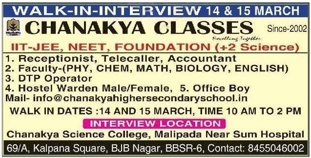 Walk-in-Interview at Chanakya Classes, Bhubaneswar: Multiple Vacancies Available