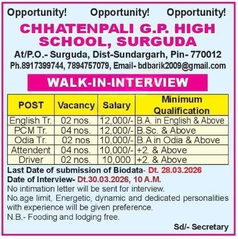 Chhatenpali G.P. High School, Surguda Recruitment 2026: Walk-in-Interview for Various Teaching & Non-Teaching Posts