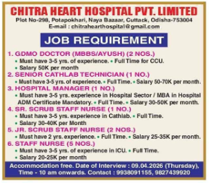 Recruitment at Chitra Heart Hospital Cuttack 2026: Chitra Heart Hospital Pvt. Limited in Cuttack, Odisha, is inviting applications for various medical and administrative positions. The hospital is located at Plot No-298, Potapokhari, Naya Bazaar, Cuttack – 753004.