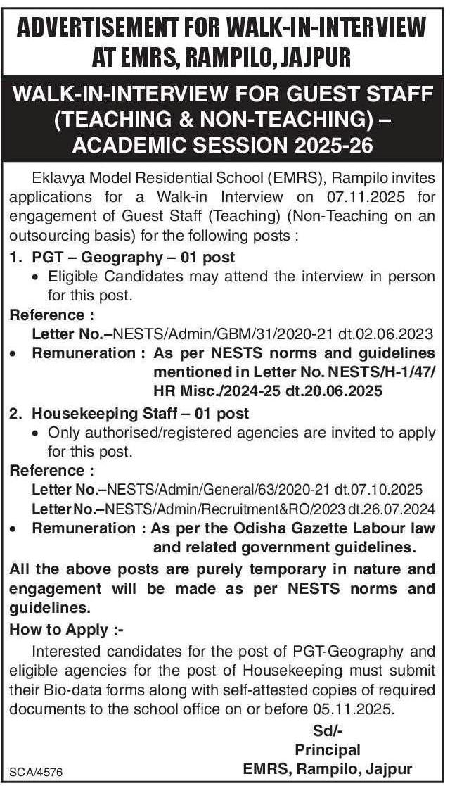 Eklavya Model Residential School (EMRS), Rampilo invites applications for attending an walk-in-interview on 15th October 2025 from interested and eligible candidates for the following guest faculties in Ekalavya model residential Rampilo jajpur. The posts are purely temporary in nature.
