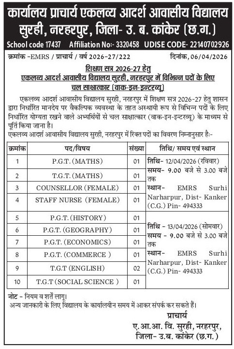 Recruitment at EMRS Surhi Narharpur 2026: The Office of the Principal, Eklavya Model Residential School (EMRS) Surhi, Narharpur, District Kanker (Chhattisgarh), has officially announced the latest EMRS Chhattisgarh recruitment for the academic session 2026-27. These positions are being filled on a temporary basis to ensure smooth educational operations.