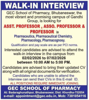 Career Opportunity: Walk-in Interviews at GEC School of Pharmacy, Bhubaneswar
