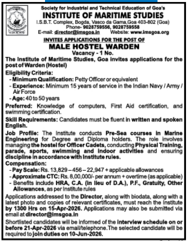 Recruitment at Institute of Maritime Studies Goa 2026: The Institute of Maritime Studies (IMS), Goa, part of the Society for Industrial and Technical Education of Goa, is officially inviting applications for the position of Male Hostel Warden. This role is specifically designed for disciplined professionals, ideally from a defense background, to manage and mentor Officer Cadets.
