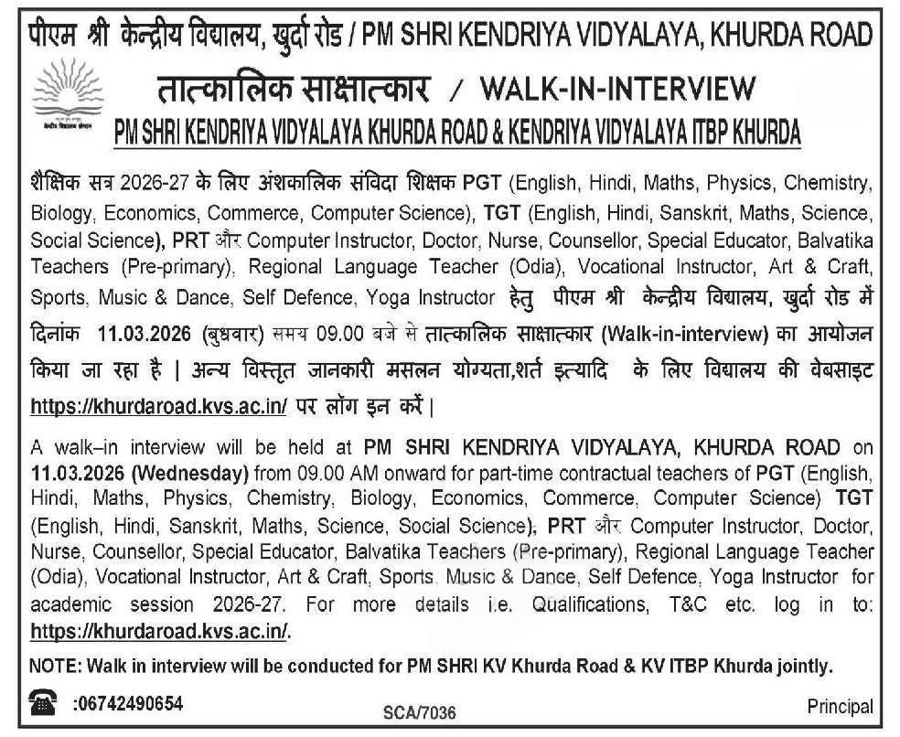 Recruitment at Kendriya Vidyalaya Khurda 2026: PM SHRI Kendriya Vidyalaya Khurda Road has announced a significant walk-in-interview for the upcoming academic session. This combined KV Khurda recruitment drive also covers requirements for KV ITBP Khurda, offering a streamlined path for educators and professionals to join these institutions on a part-time contractual basis.