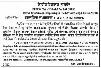 Recruitment at Kendriya Vidyalaya Talcher Angul 2026: Kendriya Vidyalaya Talcher is conducting a walk-in interview to recruit part-time contractual teachers for the 2026–27 academic session. Interested candidates for teaching jobs in Odisha can attend the interview on the date mentioned below.
