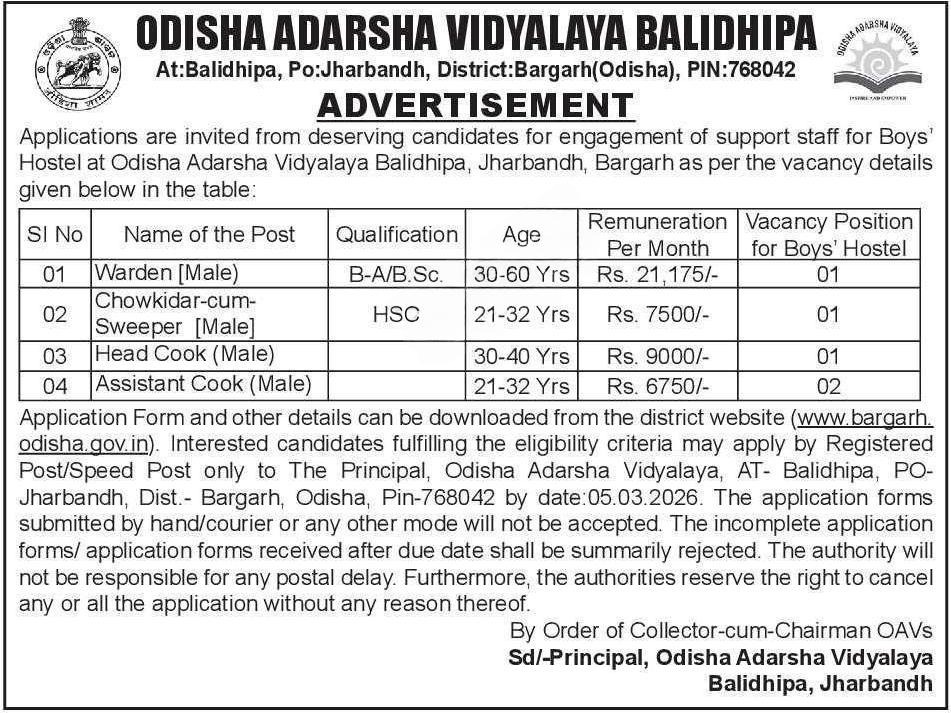 Recruitment at OAV Balidhipa Bargarh 2026: If you are looking for a stable Odisha govt job, here is a fresh notification for you. Odisha Adarsha Vidyalaya (OAV), Balidhipa, in the Bargarh district, has officially announced a vacancy for support staff in its Boys’ Hostel.