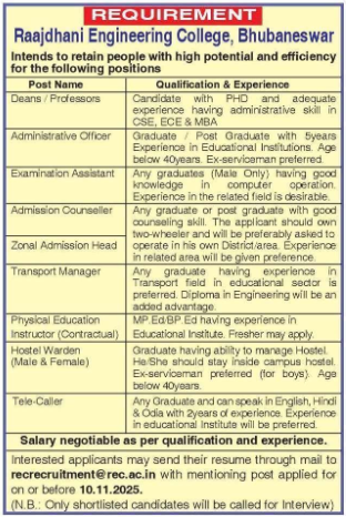 Raajdhani Engineering College (REC) Bhubaneswar intends to recruit people with high potential and efficiency for the following positions.