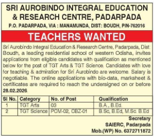 Career Opportunity: Teachers Wanted at Sri Aurobindo Integral Education & Research Centre, Padarpada