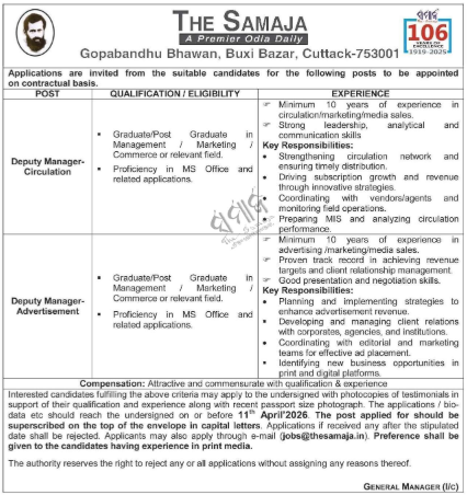 Recruitment at Samaja Odia Newspaper 2026: The Samaja, a premier Odia daily, has released a recruitment notification for the positions of Deputy Manager-Circulation and Deputy Manager-Advertisement. These roles are to be appointed on a contractual basis at their headquarters in Cuttack.