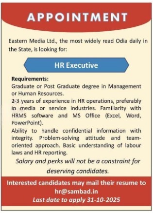 Recruitment of HR Executive position at Eastern Media Ltd., a widely read Odia daily in the State.