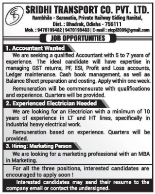 Recruitment at Sridhi Transport Bhadrak 2026: Accountant/ Electrician / Marketing Person Vacancy