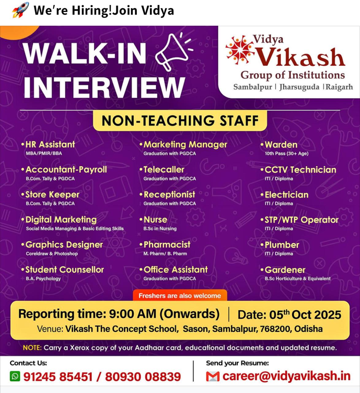 Vidya Vikash Group of Institutions, a reputed educational organization with campuses in Sambalpur, Jharsuguda, and Raigarh, is inviting applications from dynamic and dedicated candidates for multiple Non-Teaching Staff positions. This is a great opportunity for both experienced professionals and freshers to join a fast-growing institution that values skill, discipline, and innovation.