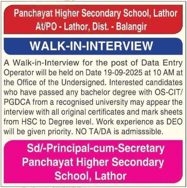 Recruitment of DEO at Panchayat HSS Lathor Balangir 2025