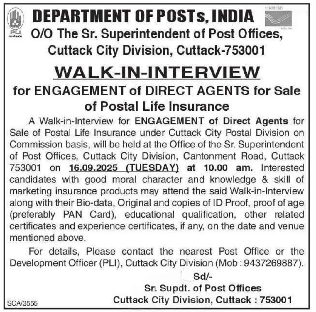 Department of Posts, India (Cuttack City Division) is conducting a walk-in interview for the engagement of Direct Agents for the sale of Postal Life Insurance on a commission basis.