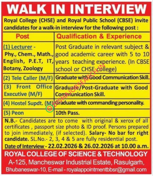 Recruitment Royal College/School Bhubaneswar 2026: Royal College of Science & Technology (CHSE) and Royal Public School (CBSE) are seeking high-caliber educators and administrative staff to join our growing academic family. If you have been searching for the latest teaching job in Bhubaneswar Odisha, this is an exceptional opportunity to advance your career in a premier residential institution.