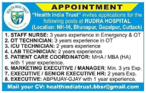 The Health India Trust has issued an official appointment notification for various medical and administrative positions at Rudra Hospital, located in Cuttack, Odisha.