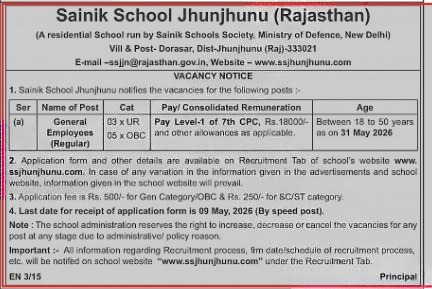 Sainik School Jhunjhunu Recruitment 2026: Vacancy for General Employees