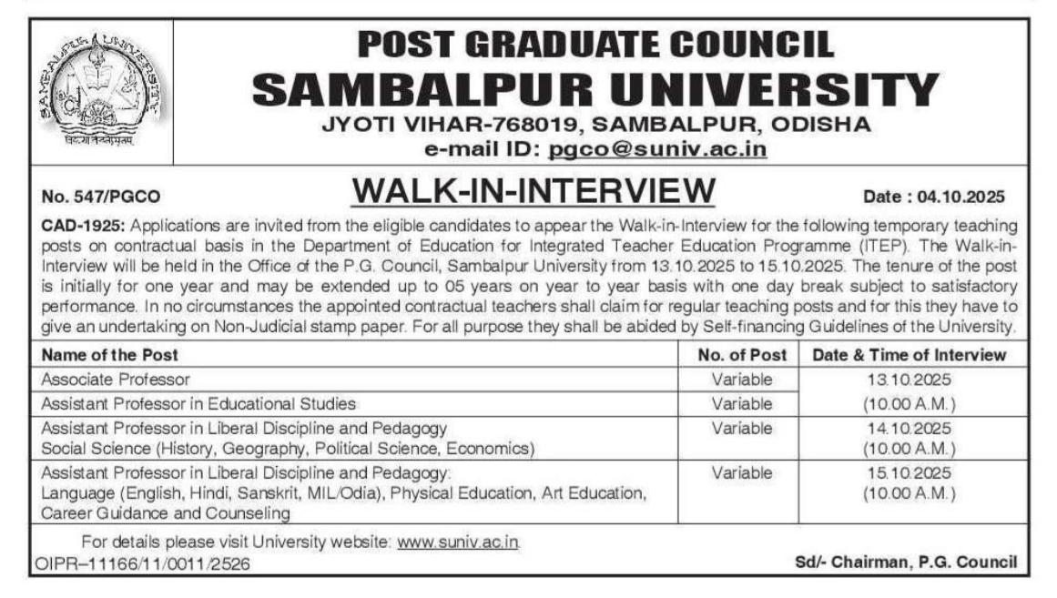 Applications are invited from the eligible candidates to appear the Walk-in-Interview for the following temporary teaching posts on contractual basis in the Department of Education for Integrated Teacher Education Programme (ITEP). The Walk-in-Interview will be held in the Office of the P.G. Council, Sambalpur University from 13.10.2025 to 15.10.2025. The tenure of the post is initially for one year and may be extended up to 05 years on year to year basis with one day break subject to satisfactory performance. In no circumstances the appointed contractual teachers shall claim for regular teaching posts and for this they have to give an undertaking on Non-Judicial stamp paper. For all purpose they shall be abided by Self-financing Guidelines of the University.