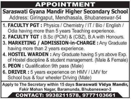 For further queries regarding the Saraswati Gyana Mandir Higher Secondary School recruitment, candidates can contact the school authorities directly at: