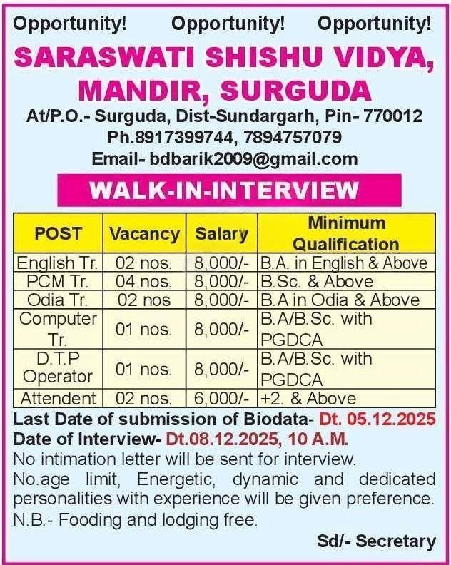 Job Opportunity: Saraswati Shishu Vidya Mandir, Surguda Sundargarh
