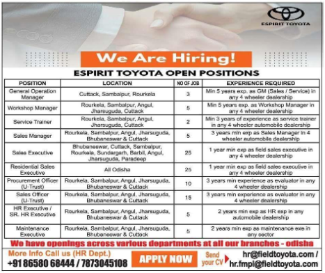 Application and Contact Information for Showroom Jobs in Odisha -Esprit Toyota Showroom across Odisha