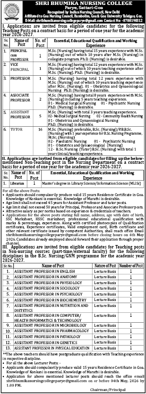 Shri Bhumika Nursing College Recruitment 2026: Shri Bhumika Nursing College, Sattari-Goa, affiliated with Goa University and recognized by the Indian Nursing Council, has released a recruitment notification for several faculty and staff positions. Eligible candidates are invited to apply for these contract-based roles for the 2026-2027 academic session.