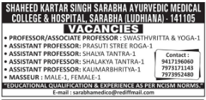 Shaheed Kartar Singh Sarabha Ayurvedic Medical College & Hospital is inviting applications for the following roles: