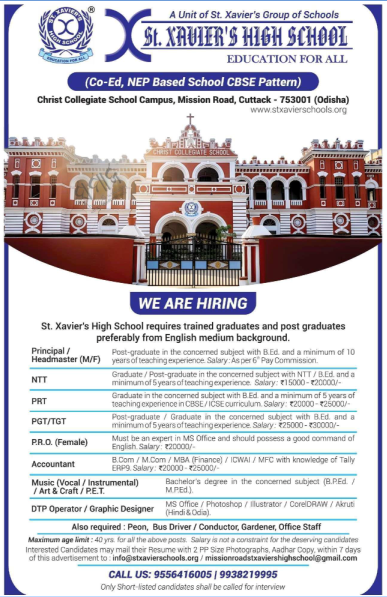 St. Xavier’s High School (Cuttack) has several academic and administrative roles available. Below are the specific requirements for each: