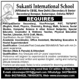 📜 Qualifications & Experience details for Sukanti International School Recruitment